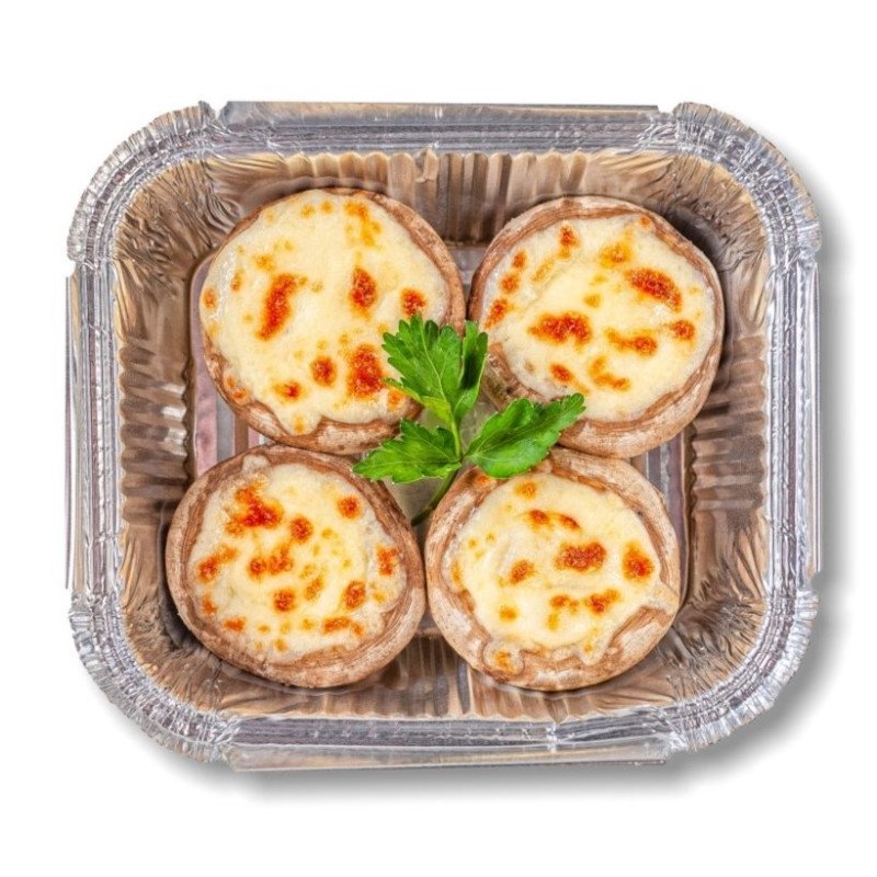 Запеченные шляпки шампиньонов с начинкой из сыра сулугуни, свежей зелени и сливочного соуса.
