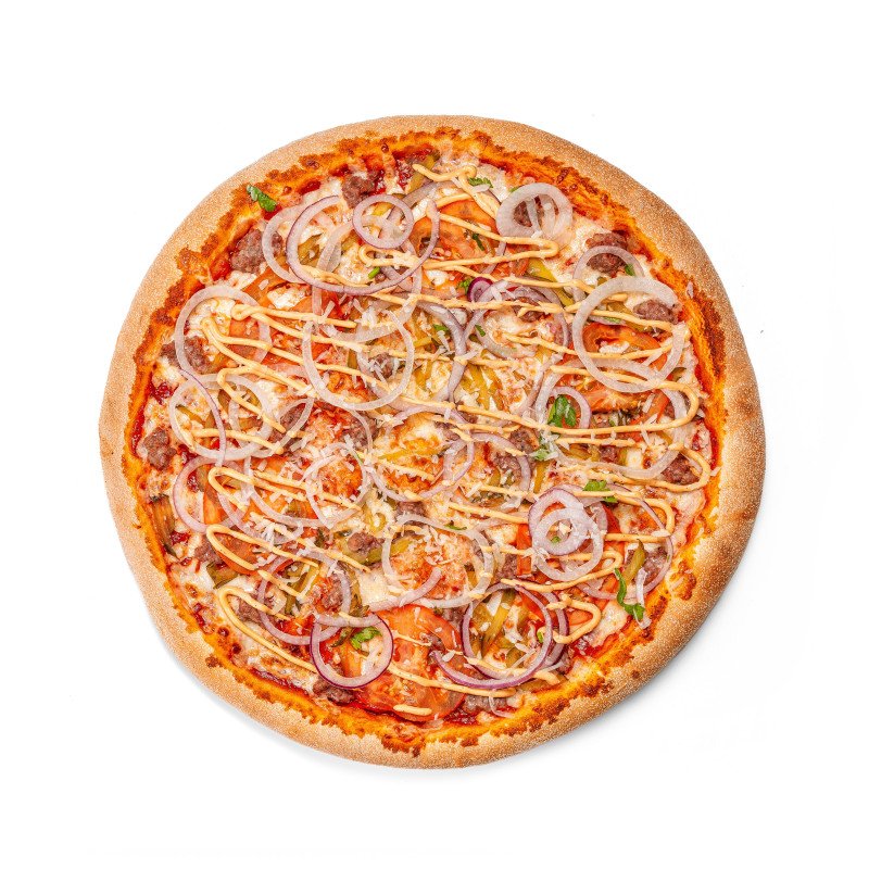 Сытная пицца на томатной основе с фаршем, шашлыком из курицы, свежим томатом, маринованным огурцом и маринованным лучком, сверху поливается соусом гриль