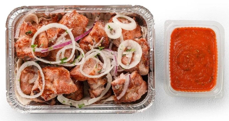 Полкило любимого шашлыка из свиной мякоти. К шашлыку подается: - Соус Шашлычный 100гр - Лаваш 100гр - Лук маринованый 30гр