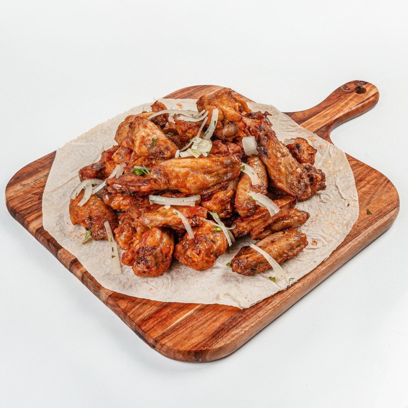 Куриные крылья - 1 кг (5 порций по 200 гр) Лук с зеленью - 100 гр Соус шашлычный - 100 гр. Лаваш - 1 шт __________________________________________ Упаковывается в один большой контейнер.
