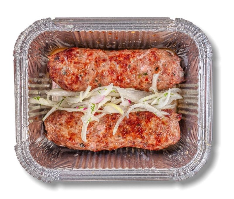 Классическое сочетание мелко рубленого фарша свинины и говядины с ароматными специями: зира, кориандр и свежая кинза. В комплекте: -Лук маринованный -30гр