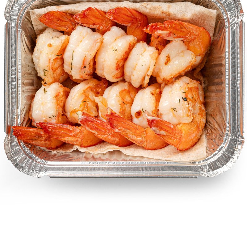 В порции 10 сочных тигровых креветок, приготовленных с добавлением чеснока и капельки лимонного сока