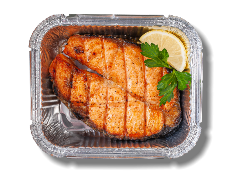 Классический стейк на кости из лосося. Подается с долькой лимона и с соусом наршараб